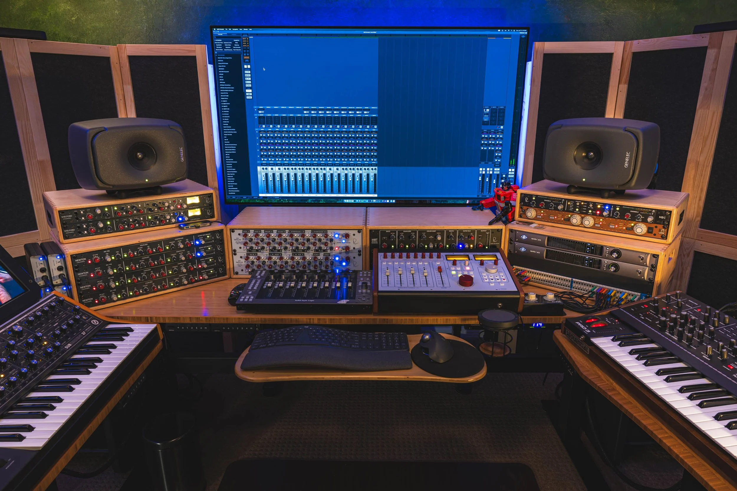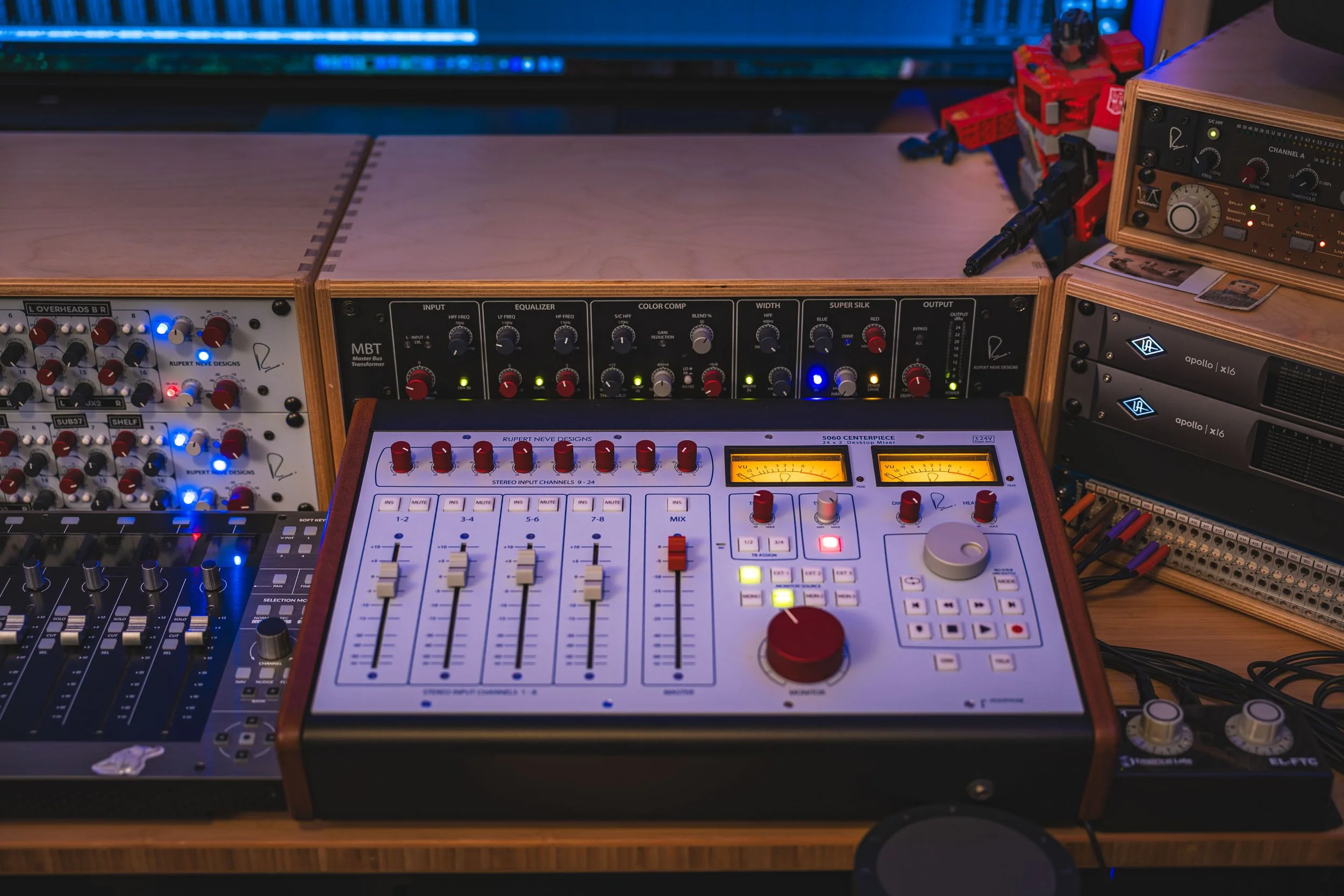 This workflow supports The OctEpus’s live “one-man band” performances, where he plays three instruments at once. With dedicated knobs, faders, EQs, and compressors under his hands, he can dial in the mix in real time while practicing, so by the time he masters the performance, the mix is already largely finished. When it’s time to record, he simply tracks individual channels via the Apollo x16 and the 5059 sends, with the two-channel MBC output handling the final mix. The insert system even allows him to instantly A/B live vs recorded versions through the exact same signal path.