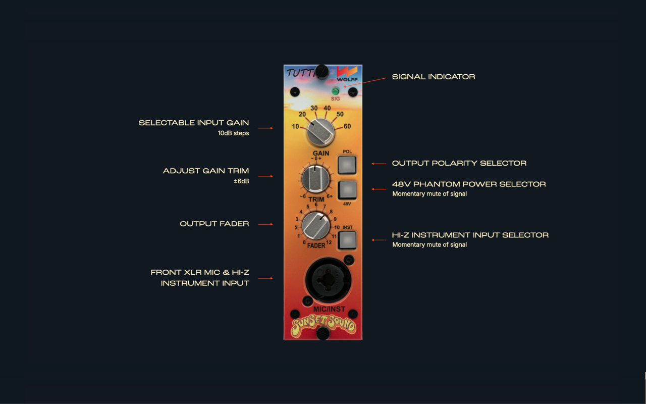 The Wolff Audio Tutti is more than a microphone preamp – it’s a revival of one of the most influential analogue circuits ever used in professional recording studios. Developed through a collaboration between Wolff Audio and the legendary Sunset Sound Recorders in Hollywood, the Tutti recreates the iconic “Floater” mic preamp that helped define the sound of countless classic recordings.