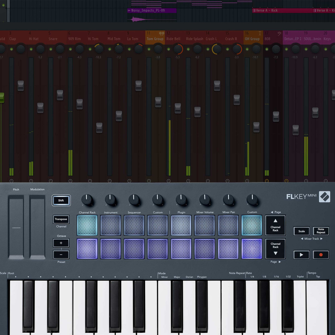 With 25 mini-keys, 16 velocity-sensitive pads, eight customisable pots, and essential transport controls, FLkey Mini puts everything you need right where you need it – so you can stay in the groove.