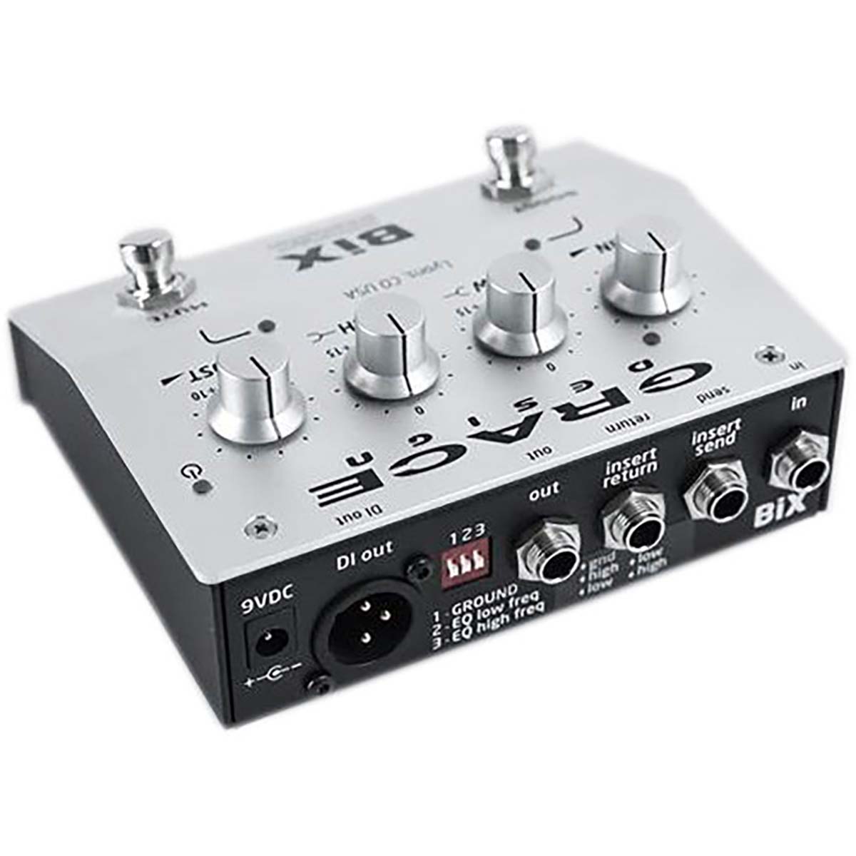 Controls are dead simple – input gain, high and low shelving EQ, and a 10dB variable boost circuit, with footswitches for mute and boost. I/O includes the instrument input, separate send and return insert jacks, an unbalanced line output, and a balanced ISO DI output on XLR. For enhanced EQ control, rear panel DIP switches select between two different transition frequencies for both High and Low controls. And BiX is pedalboard friendly, with a 9VDC power input and a compact, rugged low-profile chassis.